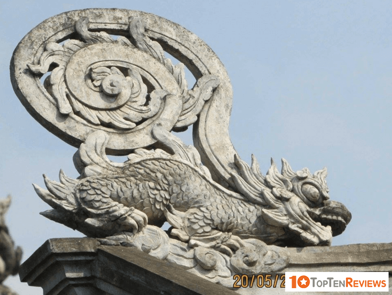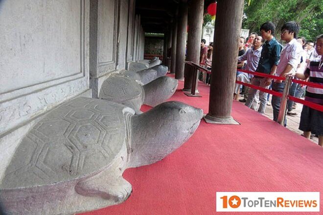 In architecture and decoration, turtles are often represented with other mascots belonging to the quartet. Still, the most popular are the images of "turtle wearing a stele" and "turtle wearing a crane" in pagodas and temples, in the Temple of Literature. Quoc Tu Giam and Temple of Literature in Hue.