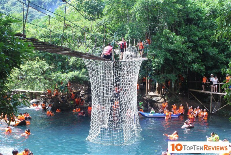 The first impression is that it is located in the middle of the forest, covered by many giant trees. Therefore, the temperature here is cool even though the summer weather of Quang Binh Province is not very pleasant. Going all the way to the end of the wooden stairs stretching more than 900 meters from the top of the hill, you will reach the cool stream below. Here, you relax on the raft, enjoy bathing in the stream, enjoy the fresh air or take a kayak along the stream if you like outdoor activities.