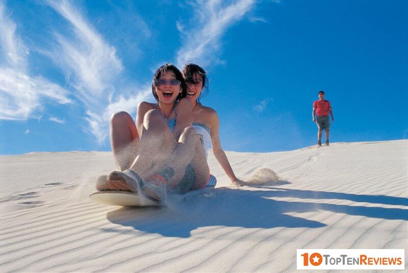 Besides, you can also explore sand skating. Skateboards are areca spathe and stiff paper. Thrillingly sliding down from above, feeling the layers of white sand clinging to your body, spreading out in space, you will feel as if you are in harmony with the immense and majestic nature. It is considered the ideal game for those who keep a good balance and love thrills.