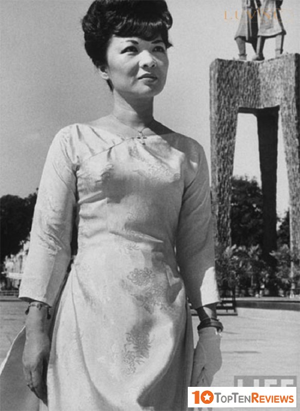 Ms. Tran Le Xuan is the wife of Ngo Dinh Nhu, who created this very new modern women's ao dai with the collar part removed a bit and replaced with a boat neck design, an open neck, and a cut neck. . Since then, bringing more diverse designs for Vietnamese Ao Dai. Besides, the texture on the shirt's body is also very fancy, with the pattern of upside-down bamboo branches.